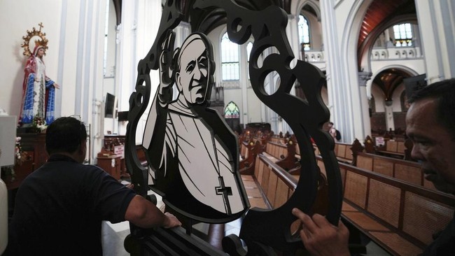 Pekerja gereja mempersiapkan ornamen yang menggambarkan Paus Fransiskus menjelang misa di Katedral Our Lady of the Assumption yang dikunjungi oleh Paus Fransiskus pada tahun 2024, di Jakarta, Senin (21/4/2025). AP/Achmad Ibrahim