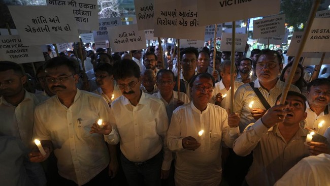 Warga membawa lilin dalam aksi damai di Ahmedabad, India, Kamis (24/4/2025), mengecam penyerangan terhadap wisatawan di Kashmir.