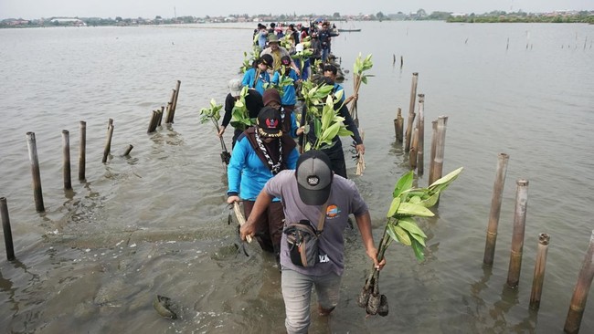 Batang - Pelajar dan relawan hijaukan pesisir Batang dengan 2.000 bibit mangrove. Aksi ini digelar untuk cegah abrasi dan jaga lingkungan.