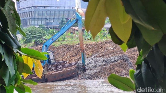 Jakarta - Kali Ciliwung, Jalan Inspeksi Ciliwung, Menteng, Jakarta, dikeruk. Dengan alat berat, petugas membersihkan lumpur untuk antisipasi pendangkalan dan banjir.