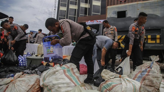 Ternate - Anggota kepolisian mengumpulkan minuman keras untuk dimusnakan. Sebanyak 7.221 Liter miras dimusnahkan polres Ternate.