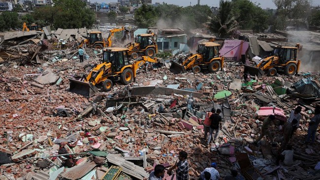 Alat berat meratakan rumah dalam operasi penggusuran kawasan padat penduduk di Danau Chandola, Ahmedabad, India, 29 April 2025.