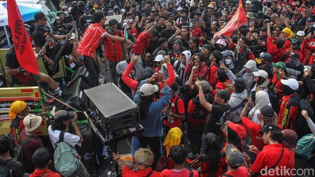 Jakarta - Suasana aksi May Day di DPR makin meriah dengan konser dari atas truk. Lagu-lagu perjuangan dan jogetan buruh mencairkan suasana orasi yang serius.