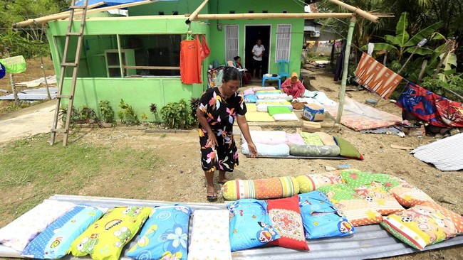 Warga menjemur barang rumah tangga usai atap rumah rusak diterjang angin puting beliung di Pentadio Timur, Gorontalo, Selasa (6/5/2025).