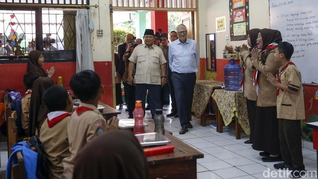 Jakarta - Presiden RI Prabowo Subianto bersama pendiri Gates Foundation, Bill Gates mendatangi SDN Jati 03 Pulogadung, Jaktim. Mereka meninjau makan bergizi gratis (MBG).