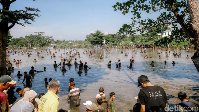 Depok - Ratusan warga tampak antusias mengikuti kegiatan Ngubek Empang yang digelar di kawasan Pengasinan, Depok, pada Minggu (11/5).