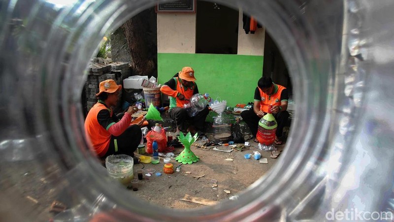 Petugas Unit Penanganan Sampah Badan Air Dinas Lingkungan Hidup membuat karya seni dari limbah botol plastik di Waduk Elok, Cakung, Jakarta Timur.