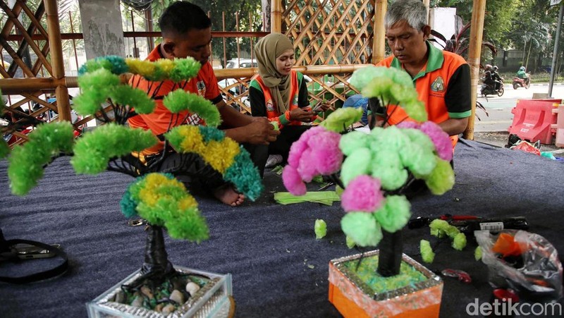 Sejumlah petugas UPS Badan Air Kecamatan Gambir membuat kerajinan bunga dari plastik kresek di kawasan Gambir, Jakarta Pusat.
