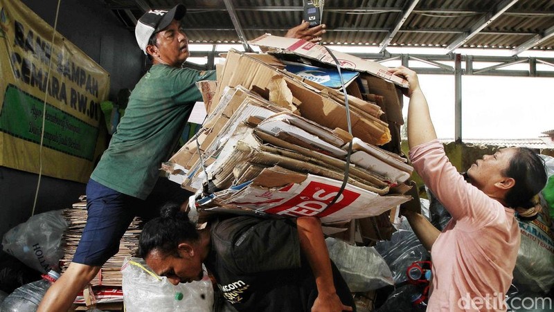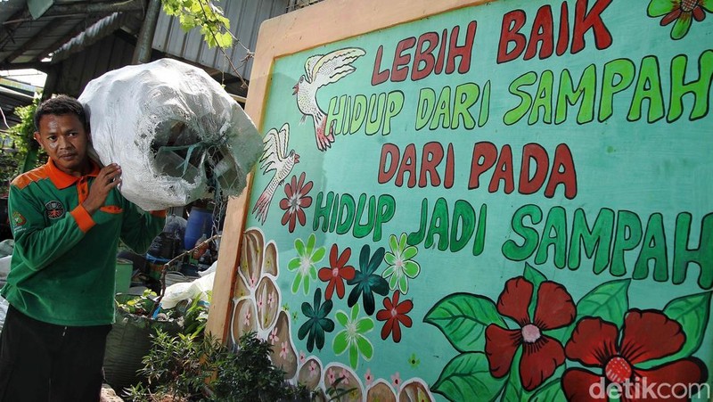 Seorang anggota bank sampah membawa sampah plastik di Koja.