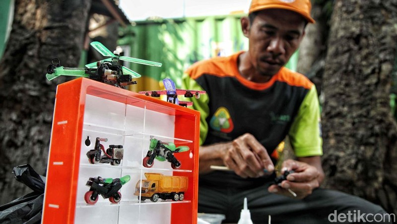 Petugas UPS Dinas Lingkungan Hidup, Timan membuat miniatur dari sampah bekas korek api di Jakarta Pusat.