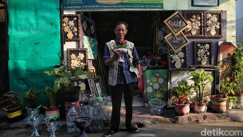 Sutrisno seorang seniman yang sering membuat karya seni dari sampah anorganik berpose di depan tokonya kawasan Tanjung Priok, Jakarta Utara.