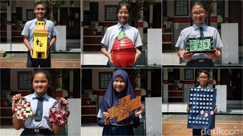 Foto kolase sejumlah murid Barunawati 4 memperlihatkan karyanya yang terbuat dari bahan baku sampah anorganik.