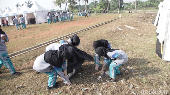 Ada pemandangan berbeda pagi ini di Alun-alun Cikande, Serang, Banten, Jumat (16/5/2025). Warga dan pelajar tampak aktif membersihkan sampah di sekitar area festival usai mengikuti senam massal pembuka.