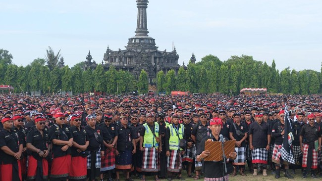 Jakarta - Ribuan pecalang Bali nyatakan dukungan pada Sipandu Beradat & TNI-Polri, serta menolak ormas berkedok pengamanan yang bertindak preman.