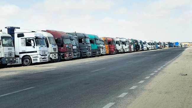 Ratusan truk bermuatan bantuan kemanusiaan, termasuk makanan dan obat-obatan, terus menumpuk di kota Al Arish, Sinai Utara, Mesir, Senin (19/5/2025). Mereka menanti izin untuk menyeberang ke Gaza melalui perbatasan Rafah. Penutupan perbatasan ini terjadi sejak Mei 2024, ketika militer Israel mengambil alih sisi Palestina dari perbatasan tersebut, menghentikan aliran bantuan meskipun kondisi kemanusiaan di Gaza memburuk. Beberapa bantuan bahkan telah kedaluwarsa dan dibuang di area terbuka Al Arish karena terlalu lama tertahan.