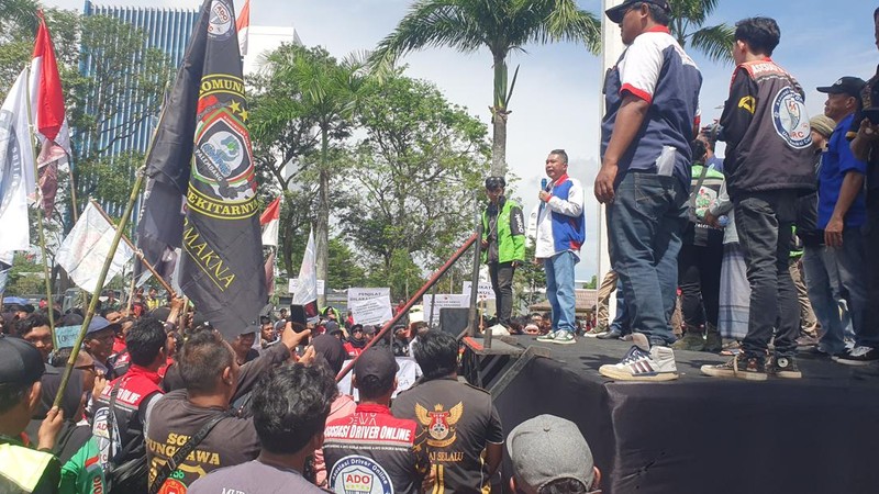 Ada 4 tuntutan yang disampaikan dalam aksi ini. Yakni soal legalitas ojol, penetapan tarif per kilometer, sanksi untuk perusahaan ojol yang melanggar dan terakhir setop potongan-potongan aplikasi. (A Reiza Pahlevi)