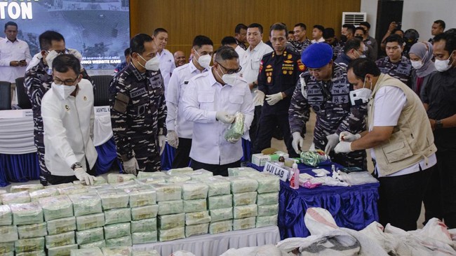 Jakarta - TNI AL memusnahkan barang bukti 2,061 ton narkotika jenis sabu-sabu dan kokain hasil tangkapan di Selat Durian