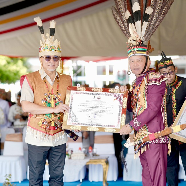 Jakarta - Menteri Koordinator Bidang Pangan Zulkifli Hasan (Zulhas) mendapatkan gelar kehormatan adat Dayak dari Pengurus Dewan Adat Dayak (DAD) Kalimantan Tengah.