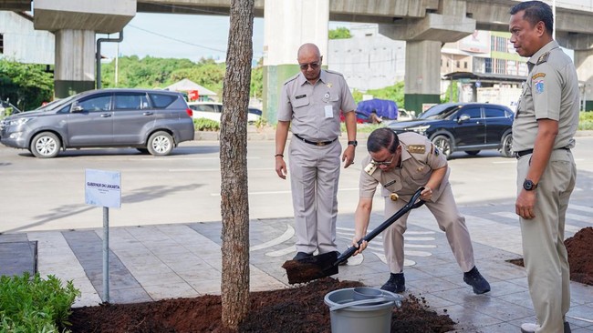 Jakarta - Gubernur DKI Jakarta Pramono Anung tanam pohon di Cakung, Jakarta Timur. Langkah ini untuk serap polusi dan turunkan suhu kawasan industri.