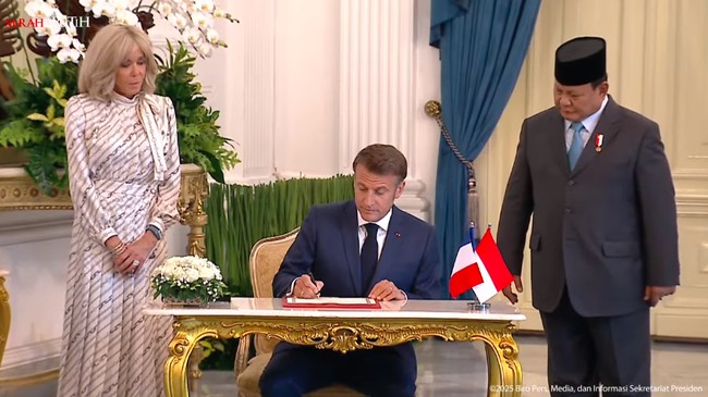 Momen itu terjadi di tengah kunjungan kenegaraan Macron di Istana Merdeka Jakarta, Rabu (28/5/2025). Macron awalnya menandatangi buku tamu. Macron dan Brigitte lalu memasuki ruang kerja Prabowo di Istana. (Youtube Sekretariat Presiden)