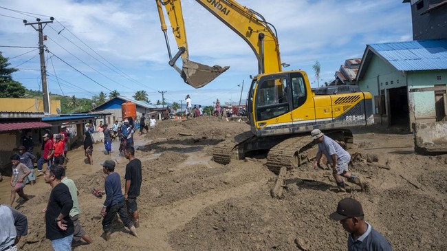 Pekerja dikerahkan dengan menggunakan alat berat untuk membersihkan jalan dari lumpur dan material kayu yang terbawa arus. Lumpur yang menutup jalan utama membuat jalur transportasi lumpuh total. ANTARA FOTO/Basri Marzuki