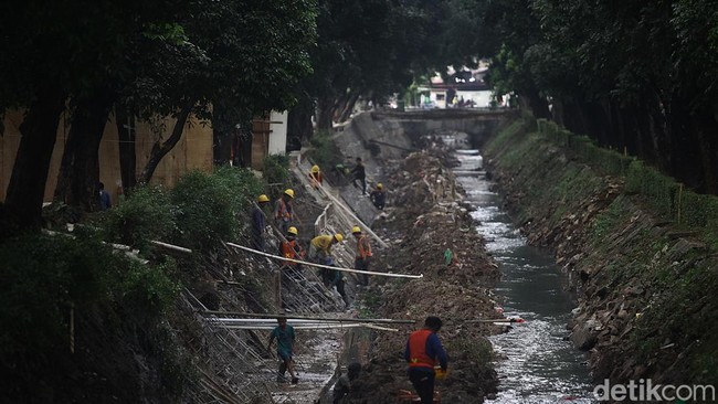 Jakarta - Pekerja memperbaiki turap Kali Minangkabau, Jakarta Selatan. Langkah ini dilakukan untuk cegah longsor dan jaga fungsi resapan air kawasan padat.