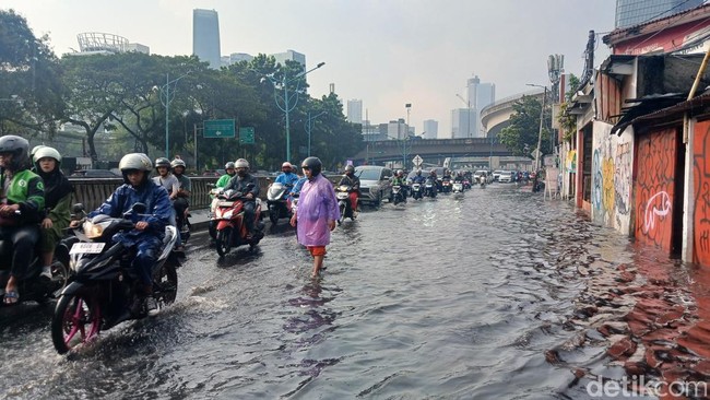 Jakarta - Jalan terusan HR Rasuna Said samping Underpass Mampang-Kuningan, Jakarta, tergenang. Jalanan tergenang usai hujan deras yang mengguyur.