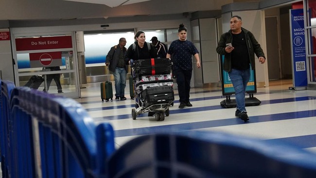 Para pelancong tiba di Terminal 4 di Bandara Internasional John F. Kennedy, menjelang pemberlakuan kembali larangan perjalanan baru oleh Presiden AS Donald Trump yang melarang warga negara dari 12 negara memasuki AS, di New York, AS, Minggu 8 Juni 2025. Foto: REUTERS/Bing Guan