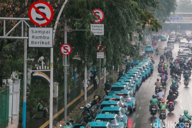 Sejumlah taksi listrik terlihat mengantre di kawasan Stasiun Gambir, Jakarta, pada Senin (9/6/2025), meskipun ada larangan tegas yang terpasang untuk berhenti atau parkir di sepanjang bahu jalan tersebut.