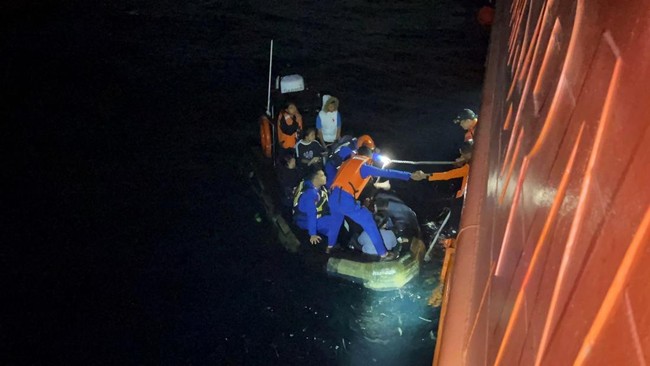 Personel Basarnas Kendari mengevakuasi penumpang KM Alif Berkah 01 rute Kabupaten Konawe Kepulauan menuju Kendari ke atas KN Pacitan di Perairan Pulau Bokori di Konawe, Sulawesi Tenggara, Senin (9/6/2025). ANTARA FOTO/HO-Basarnas