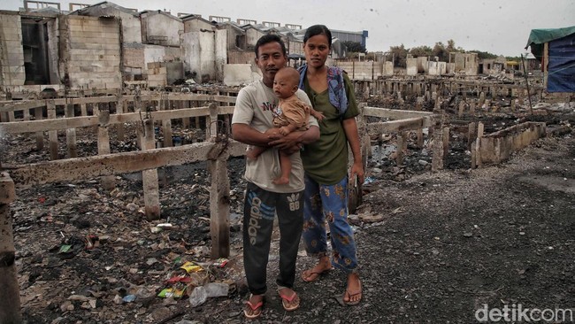 Eko bersama istri dan anaknya berpose di area bekas kebakaran. Mereka tinggal disana mengontrak dan semuanya terbakar tak tersisa.