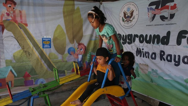 Anak-anak pengungsi etnis Rohingya bermain di tempat penampungan sementara Mina Raya, Padang Tiji, Kabupaten Pidie, Aceh, Jumat (13/6/2025). Foto: ANTARA FOTO/Irwansyah Putra