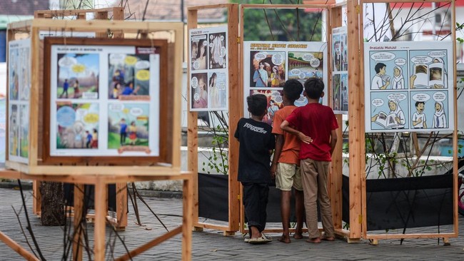 Sejumlah anak mengamati komik yang dipajang pada pameran warisan budaya di Kawasan Benteng Speelwijk, Kota Serang, Banten, Jumat (13/6/2025). Foto: ANTARA FOTO/Muhammad Bagus Khoirunas