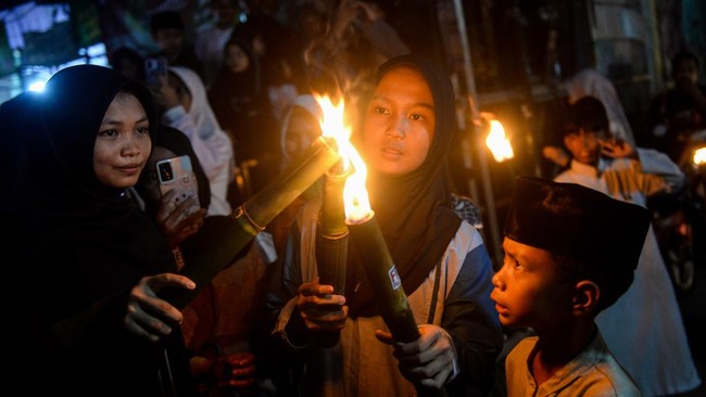 Jakarta - Masyarakat menggelar pawai obor dalam rangka menyambut tahun baru Islam. Begini potretnya di berabagai daerah.