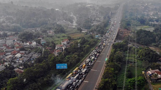 Foto udara antrean kendaraan keluar gerbang Tol Ciawi, jalur wisata Puncak, Ciawi, Kabupaten Bogor, Jawa Barat, Jumat (27/6/2025). Foto: ANTARA FOTO/YULIUS SATRIA WIJAYA