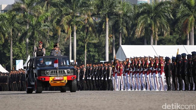 Jakarta - Prabowo memimpin upacara HUT Bhayangkara ke-79 di Monas. Ia menginspeksi pasukan dari kendaraan Maung dan sempat memberikan bintang penghargaan.