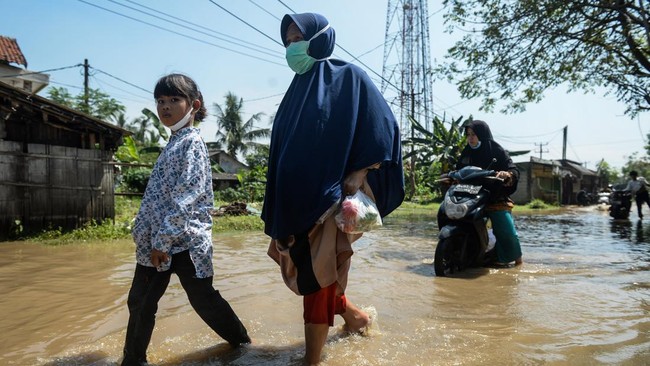 Warga menembus genangan air di Desa Gaga, Tangerang, saat banjir melanda akibat luapan Sungai Cisadane, Minggu (6/7/2025). ANTARA FOTO/Putra M. Akbar