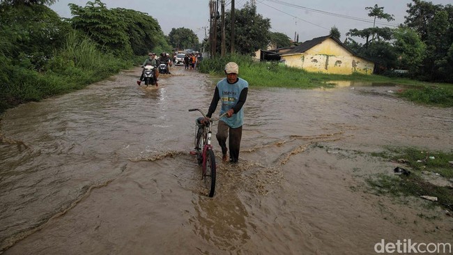 Bekasi - Banjir kiriman Bogor mengakibatkan Kali CBL meluap dan merendam Jalan Raya Kedung Pengawas, Babelan, Bekasi. Lalu lintas pun tersendat sejak pagi.