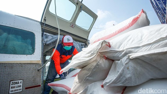 Petugas BNPB menyiapkan garam khusus ke atas pesawat di Bandara Halim Perdanakusuma, Jakarta, Kamis (10/7/2025).