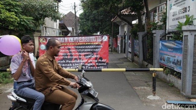 Pelajar melintasi portal yang menutup akses kendaraan menuju SMAN 3 Tangsel, Kecamatan Pamulang, Senin (14/7/2025).