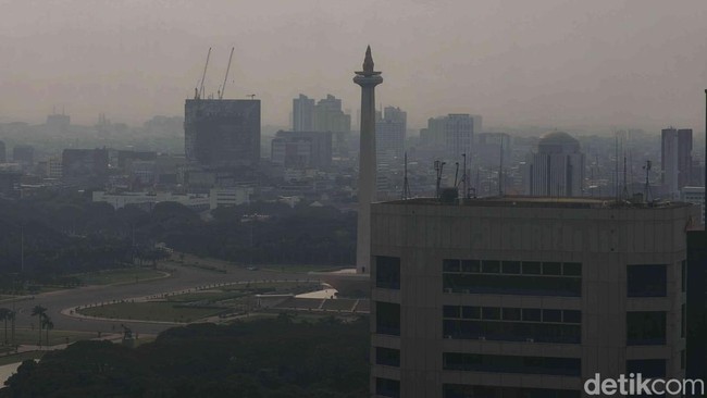 Jakarta - Kabut akibat polusi kembali menyelimuti langit Jakarta. Jarak pandang terganggu, landmark ikonik tertutup lapisan debu dan udara berwarna abu-abu.