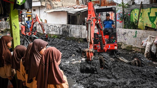 Jakarta - Upaya atasi banjir, Suku Dinas Sumber Daya Air (SDA) Jakarta Pusat menurunkan alat berat untuk melakukan pengerukan sedimentasi di aliran Kali Krukut, Jakarta.