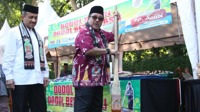 Wakil Gubernur DKI Jakarta Rano Karno (kanan) disaksikan Walikota Jakarta Selatan M Anwar (kiri) mengaduk adonan dodol betawi usai membuka Festival Cilandak Berbudaya di Lebak Bulus, Jakarta, Sabtu (19/7/2025). Foto: ANTARA FOTO/Muhammad Iqbal