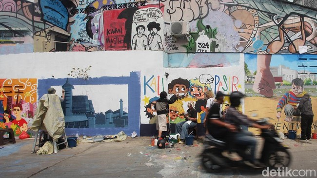 Jakarta - Dinding Kali Pasir Cikini disulap jadi kanvas mural. Kompetisi seni ini bagian dari Festival Kali Pasir 2025 yang diikuti 20 kelompok muralis.