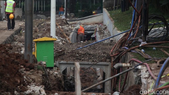 Jakarta - Lalu lintas di Simpang Fatmawati, Cilandak, Jakarta Selatan, tersendat akibat proyek trotoar. Satu lajur di Jalan RA Kartini ditutup untuk keperluan galian.
