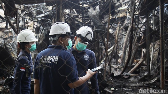 Jakarta - Tim Labfor Polri menyelidiki bekas kebakaran Pasar Taman Puring. Sebanyak 552 kios hangus dengan kerugian ditaksir capai Rp 30 miliar.