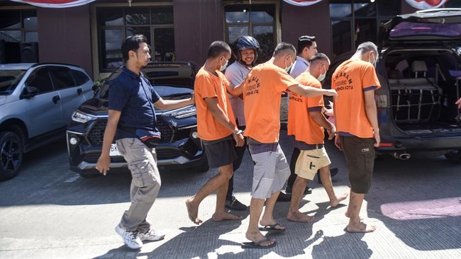 Petugas kepolisian menggiring para tersangka kasus pencurian di Mapolresta Samarinda, Selasa (5/8/2025). ANTARA FOTO/M RISYAL HIDAYAT