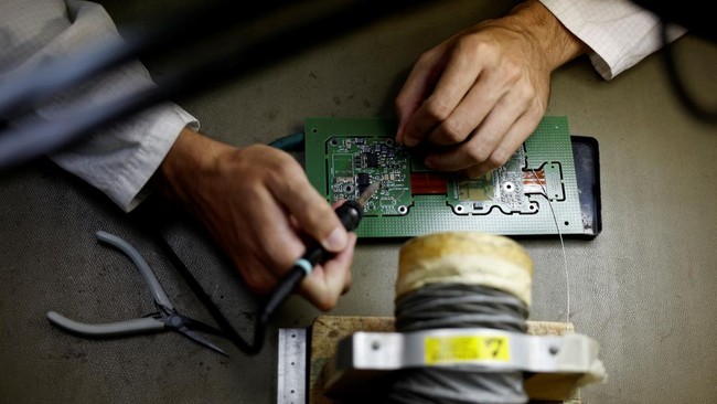 Seorang karyawan sedang mengerjakan panel papan sirkuit cetak (PCB) di Hellenic Aerospace Industry (HAI), di Tanagra, utara Athena, Yunani. Hanya butuh beberapa menit bagi sistem anti-drone baru buatan Yunani untuk menunjukkan kemampuannya. REUTERS/Louiza Vradi