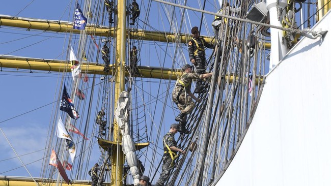 Sejumlah Taruna Akademi TNI AL (AAL) Angkatan ke-72 bersama perwakilan ASEAN Plus Cadet Sail (APCS) melakukan peran parade roll di tiang layar KRI Bima Suci-945 saat akan bertolak menuju Padang dalam rangka pelaksanaan latihan praktek pelayaran Kartika Jala Krida (KJK) 2025 Taruna Akademi TNI AL (AAL) Angkatan ke-72 di Dermaga Kolinlamil, Jakarta, Rabu (6/8/2025). ANTARA FOTO/Muhammad Adimaja
