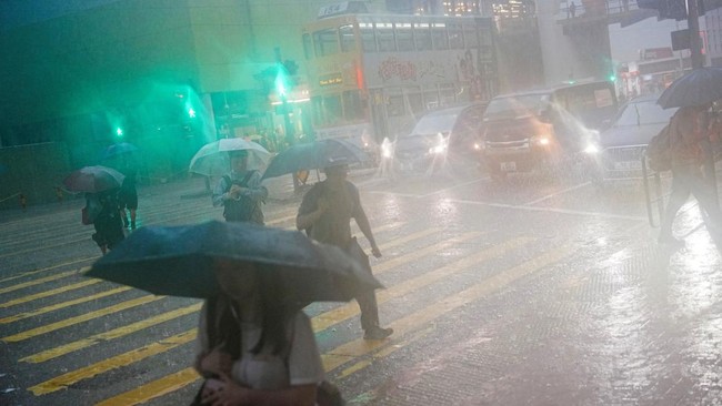 Hong Kong - Langit menghitam, kilat menyambar, dan hujan deras mengguyur Hong Kong tanpa henti. Kota modern ini berubah jadi medan banjir yang mengganggu layanan publik.